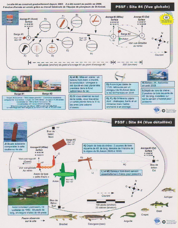 Une fois sur le Lockheed, vous pourrez apercevoir ses 2 grandes hélices ainsi qu'une urne scellée munie d'une croix, déposée juste devant l'épave ou repose l'ancien propriétaire de l'avion. Il est possible de faire une pénétration à l'intérieur du Lockheed pour les plongeurs détenant la certification requise. Vous retrouverez juste à coté du Lockheed la péniche #2 qui a sur son pont un énorme silo avec plusieurs ouvertures sur les côtés et son dessus. Explorer l'intérieur du silo n'est pas considéré comme une pénétration d'épave. Dépendamment de la saison, vous profiterez d’une visibilité de plus ou moins 20 pieds.