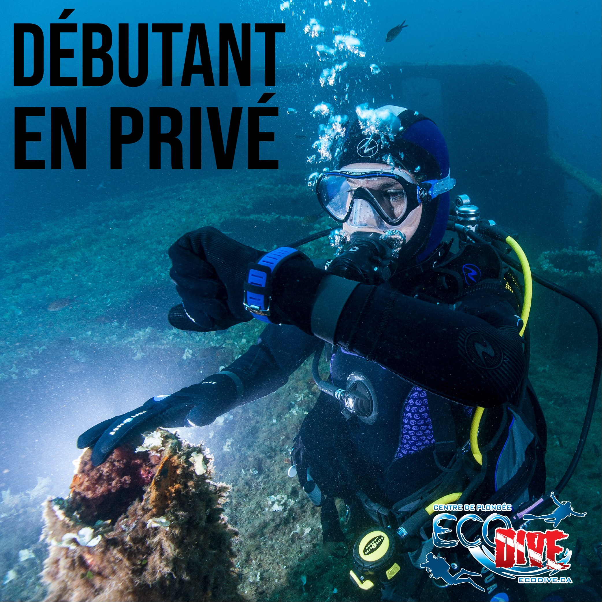 • Plongées en piscine  (piscine chauffée extérieure à même notre boutique) pour apprendre les techniques de base. Cette partie peut s'offrir sous un horaire régulier, soit en 3  séances de 3h de pratique. Elle peut aussi s'offrir sous une horaire plus intensive, soit en 2 séances de 4h.